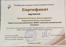 Преподаватели Симского механического техникума Новикова Н.А. и Боровкова Е.С. получили сертификаты за участие в методическом конкурсе "Бинарный урок", в рамках деятельности ОМО. Преподаватели УГПС "Машиностроение".