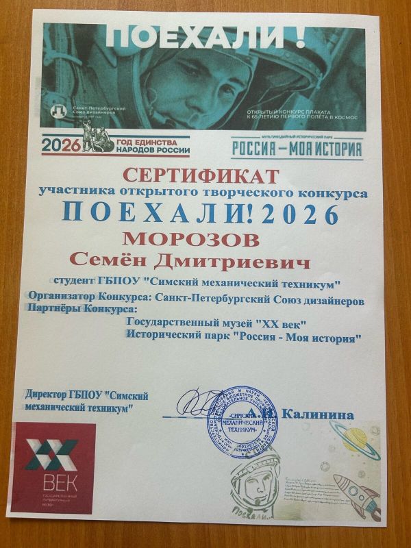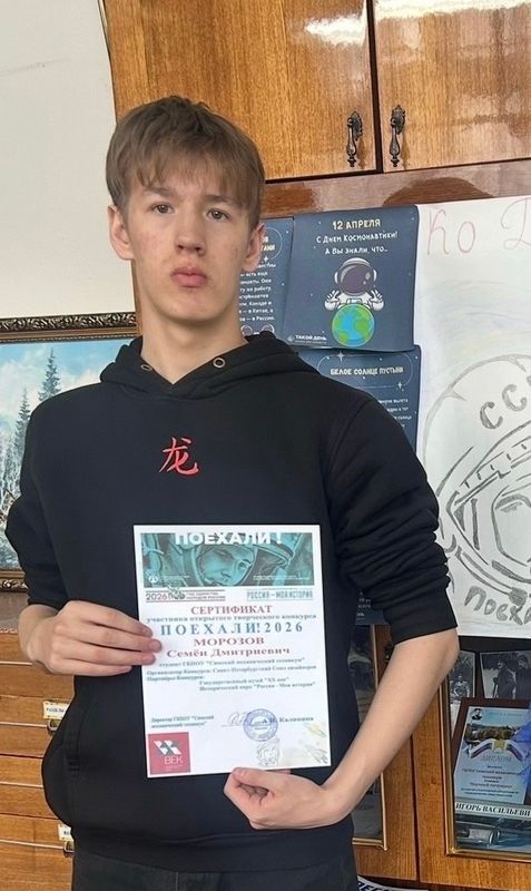 Поздравляем студента группы ТД‑1 «Б» Морозова Семёна с участием в открытом конкурсе плакатов к 65‑летию первого полёта человека в космос!