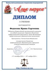 Студентка 4 курса Федосова Ирина стала ПОБЕДИТЕЛЕМ во Всероссийской дистанционной олимпиаде по учебной дисциплине «Правовое обеспечение профессиональной деятельности» среди обучающихся профессиональных образовательных организаций, преподаватель Тютина Е.М.